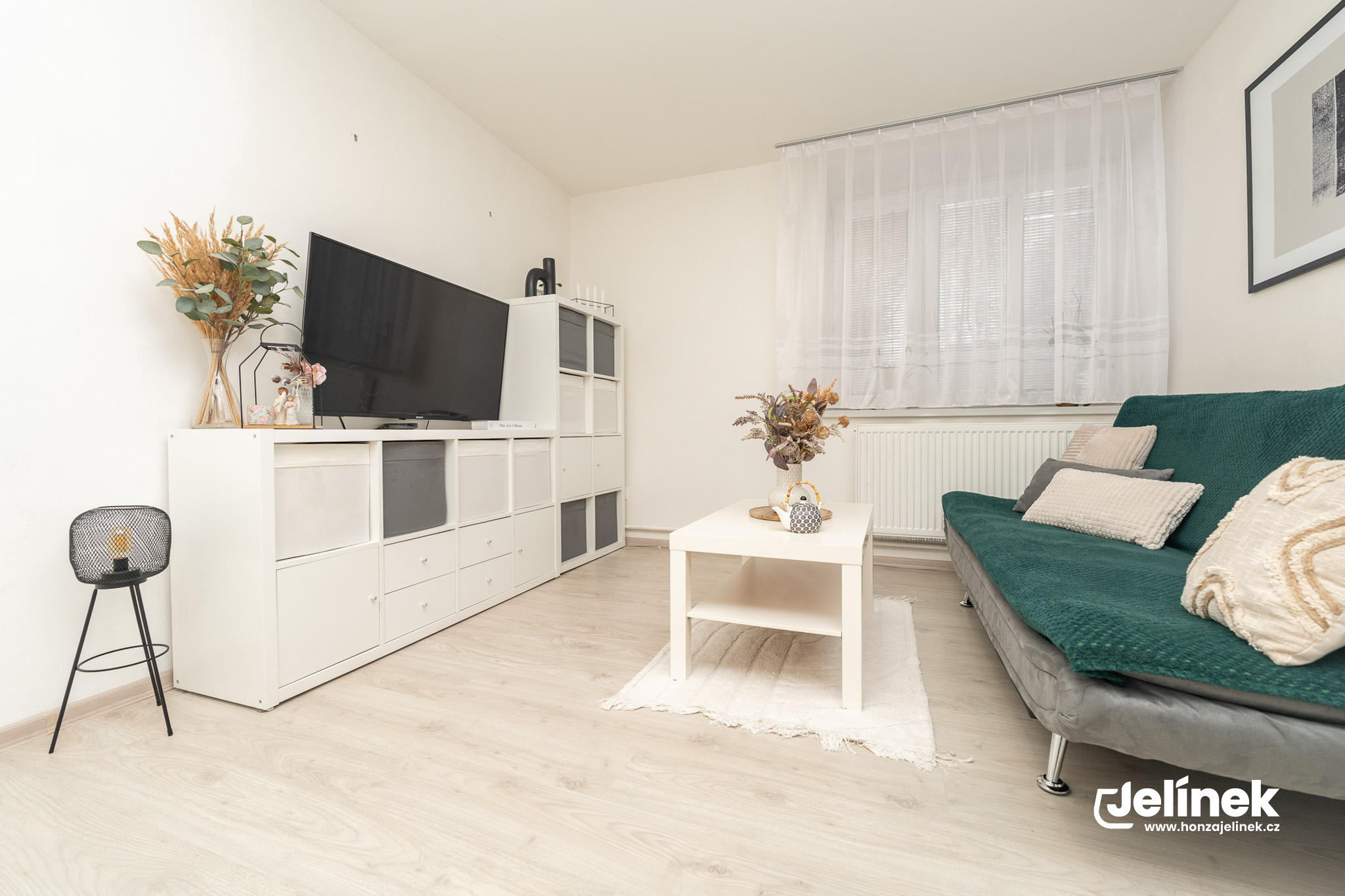 Světlý obývací pokoj s orientací na jihovýchod, který je díky velkým oknům plný slunce.