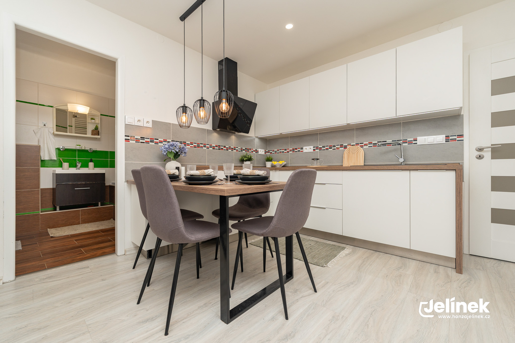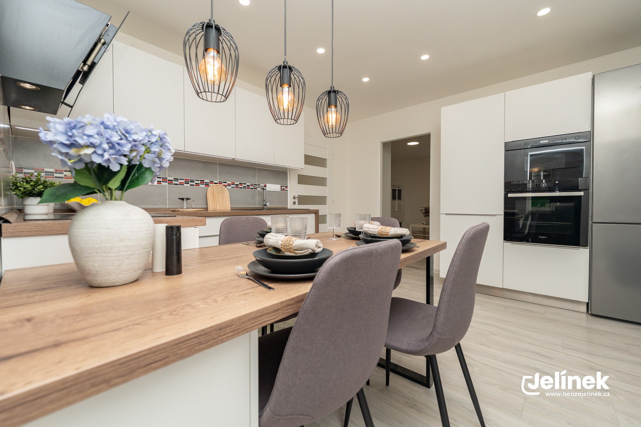 Nová kuchyně s vestavnými spotřebiči a prostorem pro jídelní stůl.