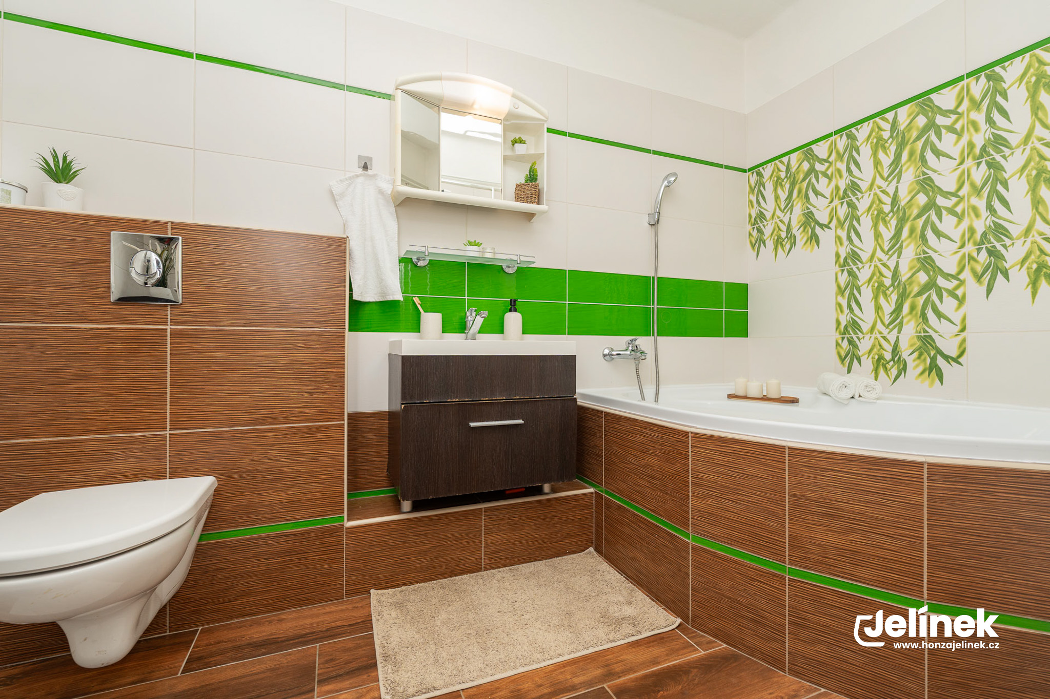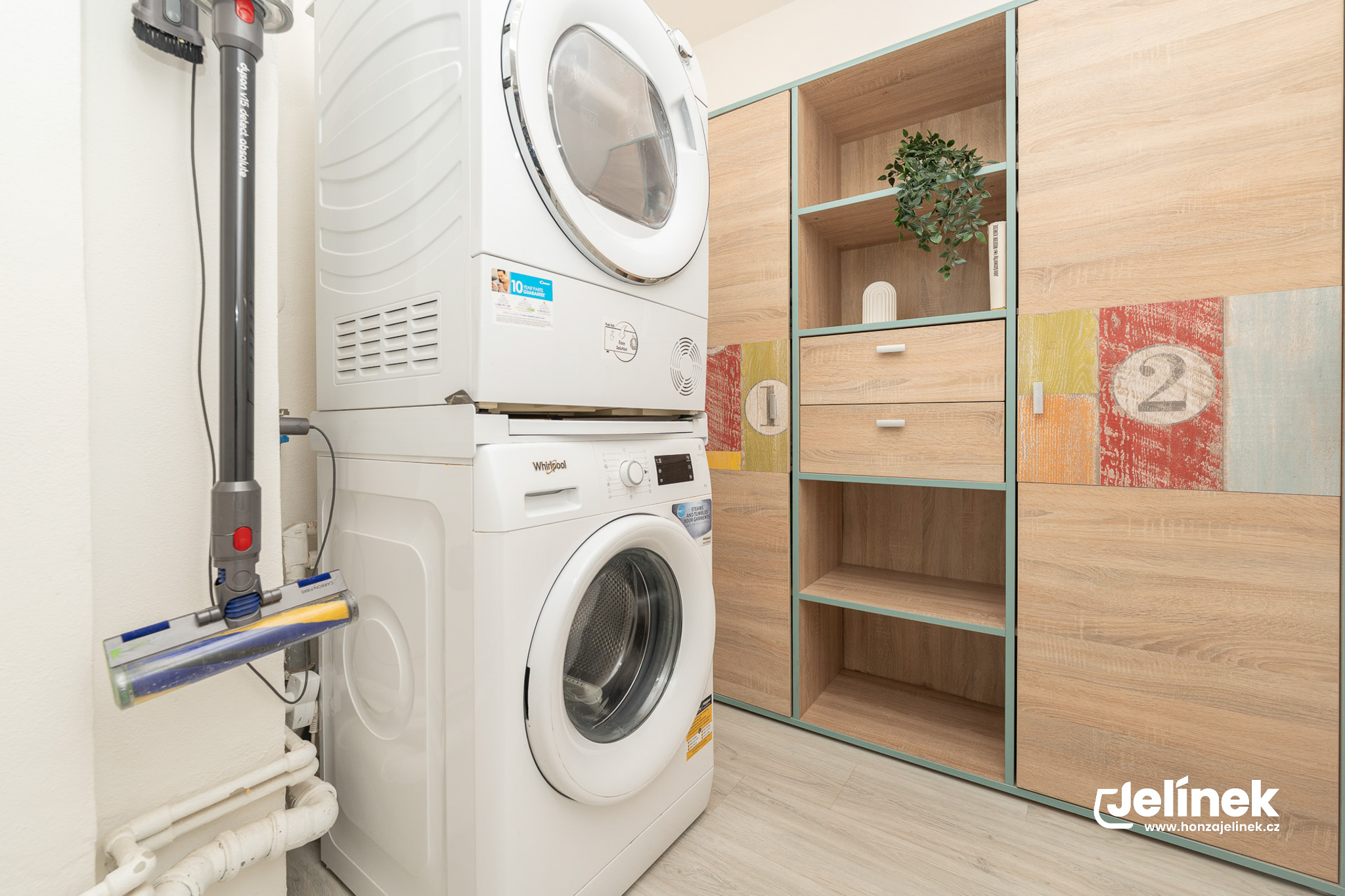 Moderní koupelna s vanou a chytře vyřešeným prostorem pro pračku a sušičku v předsíni.